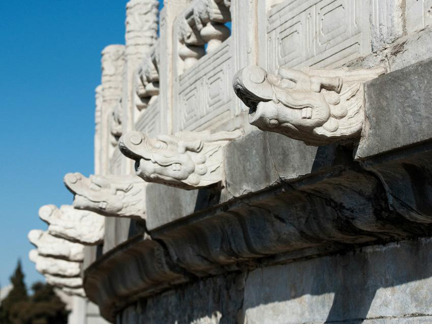 北京天壇祈年殿有三層月臺,第一層月臺上的排水構件是云頭,第二層的是鳳頭,第三層則是龍頭,這個龍頭就是螭首(chī shǒu)。同樣,故宮太和殿龍鳳云紋的望柱下就有排水螭首1142只,可以想見當大雨滂沱之時,螭首千龍吐水是何等壯觀的場面。