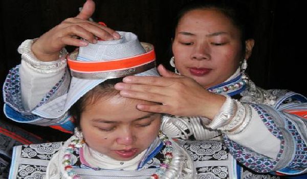 圖為革家姑娘在接請姑媽過“十四”前,母親總要為女兒作一番打扮