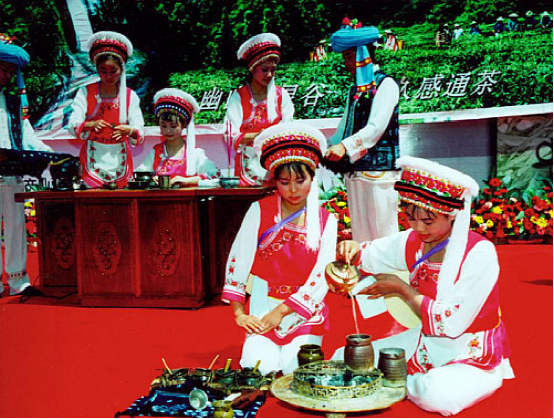 白族熱情好客,先客后主是白族待客的禮節(jié)。家中來(lái)了客人,以酒、茶相待。著名的“三道茶”就是白族的待客禮。但白族人倒茶一般只倒半杯,倒酒則需滿杯,他們認(rèn)為“酒滿敬人,茶滿欺人”。受到白族人熱情的款待,應(yīng)說(shuō)聲“挪衛(wèi)你(謝謝)”來(lái)表示你的謝意和感激之情。