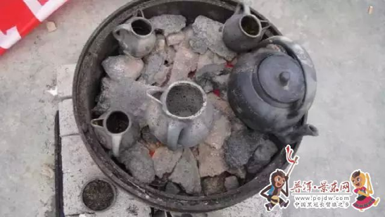 彝家糊米罐罐香茶烤罐要肚大口小,大小適中,茶具為土陶和紫砂制品為主。泡茶取無量山泉水,主要工序是用銅壺將水燒開,先將上好的糯米煎烤至黃,再將取于哀牢無量山的曬青白牙口茶放入抖烤。烤茶時要求“烤關百抖”,茶葉泛香糯米焦黃,糊米和茶葉烤好后,即沖入少量沸水,讓水自動沖除罐口浮沫,放入小片刨開的鮮姜,再加入開水煮一分鐘,即可入杯,奉給客人飲用。
