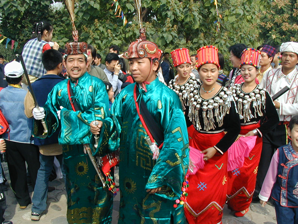 目瑙節(jié):又稱“總戈”,景頗語音譯,意思是“大伙跳舞”。目瑙節(jié)是景頗族最盛大的傳統(tǒng)節(jié)日,一般于每年農(nóng)歷正月十五以后的九天內(nèi)擇雙日舉行,節(jié)期三至五天不等。目瑙作為一種大型的群眾性歌舞活動(dòng),由來已久,歷史上,每逢豐年,出征、凱旋、婚姻嫁娶、敬祭鬼神等重要活動(dòng),均要跳“目瑙”。景頗族的“目瑙縱歌”原來是一種融宗教和文化習(xí)俗為一體的傳統(tǒng)慶典。隨著社會的發(fā)展,逐漸演化為各種不同類別的“目瑙”。大致有以下幾種:①“歲目瑙”,家庭財(cái)源茂盛,人丁興旺時(shí)舉行;②“布當(dāng)目瑙”,征戰(zhàn)取得勝利時(shí)舉行;③“貢冉目瑙”,同胞兄弟分家自立門戶時(shí)舉行;④“騰肯目瑙”,新建房屋住所落成時(shí)舉行;⑤“空然目瑙”貴族家娶親辦婚禮時(shí)舉行;⑥“達(dá)如目瑙”,出征時(shí)舉行;⑦“昔目瑙”,有名望的長者去世送葬時(shí)舉行;⑧“柱目瑙”,祭奠“木代”神時(shí)舉行。不同類別的“目瑙”都有特定的內(nèi)容和表現(xiàn)形式,但有一個(gè)共同點(diǎn)就是整個(gè)過程都是由“瑙雙”(領(lǐng)舞)隊(duì)和“瑙巴”(表演)隊(duì)組成的舞隊(duì)來表現(xiàn)和完成的。每逢目瑙節(jié)日,村村寨寨的景頗人身著節(jié)日盛裝,紛紛從四面八方涌入目瑙廣場。廣場上人山人海,氣氛熱烈歡快而不失莊嚴(yán)古樸的特色。廣場中央高豎著四根長約4米的目瑙柱,亦稱雌雄柱,中間兩根為陰,外面兩根為陽,上面皆繪有精美而富有象征意義的圖案:右邊柱上往往繪以蕨菜花紋,象征團(tuán)結(jié)奮進(jìn);左邊常畫回紋構(gòu)成若干個(gè)四方形,并涂以不同顏色,表示景頗族的遷徙路線;中間兩根柱子之間,交叉著兩把長刀,為景頗民族驍勇強(qiáng)悍、堅(jiān)強(qiáng)剛毅性格的具體標(biāo)志。目瑙柱的左側(cè)立著一個(gè)方形架子,上層是吹嗩吶的座位;前面掛著一個(gè)兩米長的大皮鼓和一面直徑一米多的大芒鑼,供跳舞時(shí)伴奏用。廣場四周用竹籬笆圍起,目的是為了防止野鬼的侵入和牲畜的干擾。舞蹈開始時(shí),鼓樂齊鳴,由兩位德高望重且又熟悉目瑙舞路線的老人身穿大龍袍,頭戴飾有孔雀、野雞羽毛和野豬牙齒的目腦帽,手持長刀領(lǐng)頭,后面跟著背銅炮和持長刀的隊(duì)伍,婦女們拿著扇子或彩帕跟在最后,邊歌邊舞,熱鬧非凡。參舞者少則百多人,多則幾千人,從清晨到日暮,以日暮到清晨,通宵達(dá)旦,其間舞者跳累時(shí)可自動(dòng)退場小歇片刻,然后繼續(xù)登場舞蹈?!澳胯Эv歌”作為一個(gè)民族的傳統(tǒng)活動(dòng)發(fā)展至今,宗教色彩和類別已日益淡化,它已成為景頗族約定俗成的傳統(tǒng)節(jié)日,統(tǒng)稱為“統(tǒng)肯(傳統(tǒng))目瑙”并賦予了新的內(nèi)涵,其內(nèi)容和形式都是展示一個(gè)民族的傳統(tǒng)文化,反映今天的新生活和對未來的美好向往。