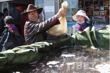 在當(dāng)?shù)厮幫跎睫r(nóng)貿(mào)市場(chǎng)可以看到,很多信眾或帶著器皿或拿著塑料口袋前往水產(chǎn)店買魚放生。甚至有的信眾開著一輛面包車,車廂用塑料包裹,里面裝滿水,載著買來的一整車魚前往拉薩河放生。 “薩嘎達(dá)瓦節(jié)期間,魚賣的特別快,藏歷十五的時(shí)候我們的魚都被買光了?!彼a(chǎn)市場(chǎng)的李老板說。