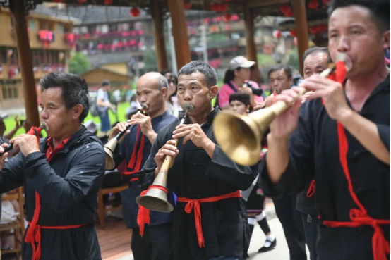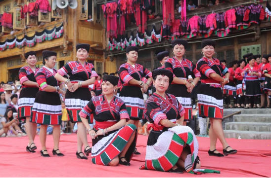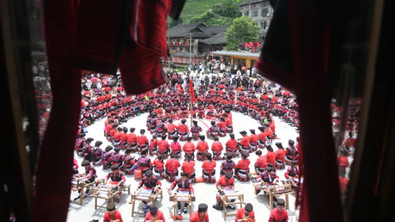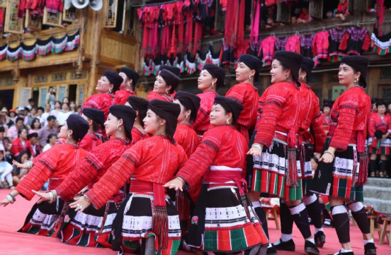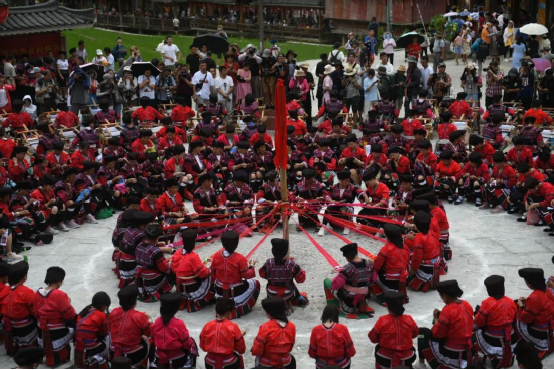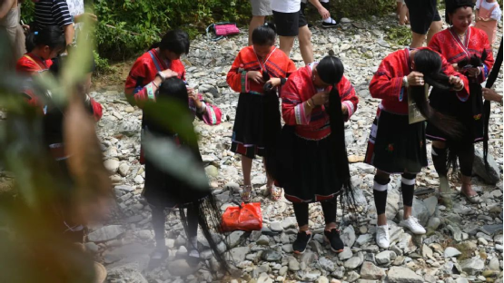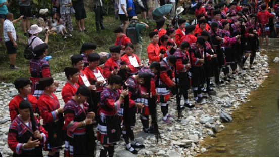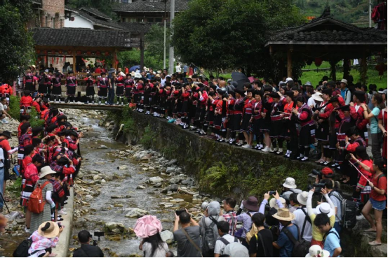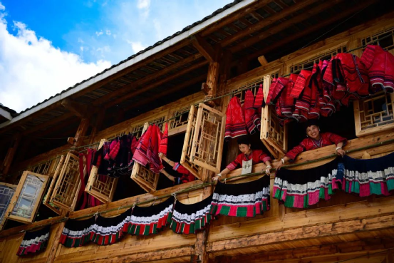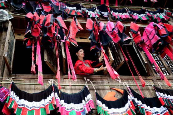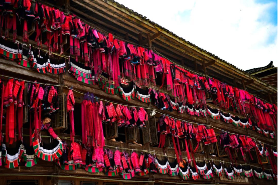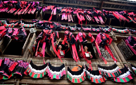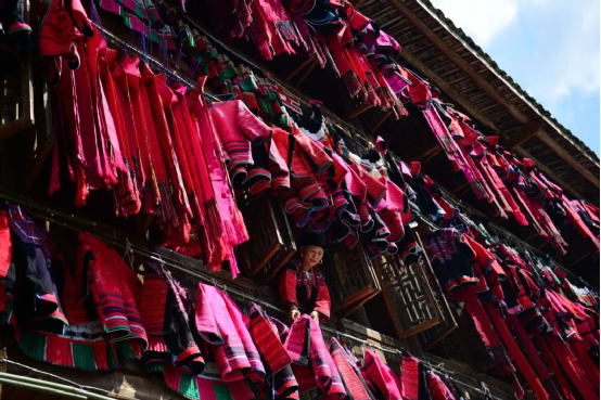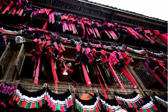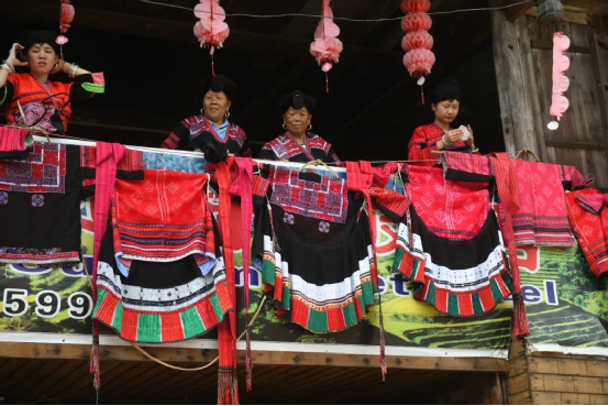 這一天,寨子里賓客盈門熱鬧異常,嫁出去的女兒和在外寨入贅的兒子都要挑著鴨子、酒和禮品,背著小孩回家吃團圓飯,家家戶戶包粽子過大節(jié)。紅瑤姑娘和嫂子們,紛紛推開窗戶,拿出民族盛裝一件件掛在窗外晾曬,整個寨子掛滿了紅衣服,顯得格外鮮艷奪目。