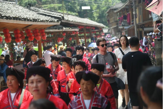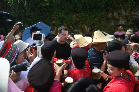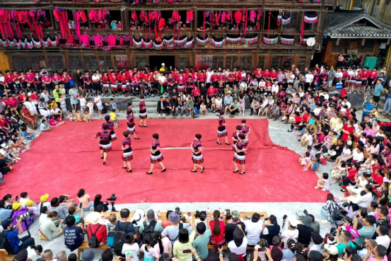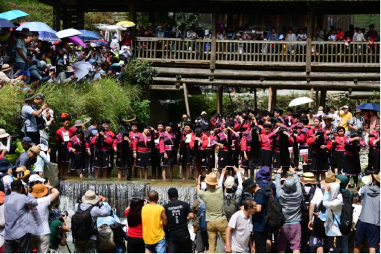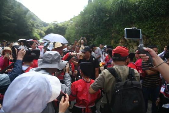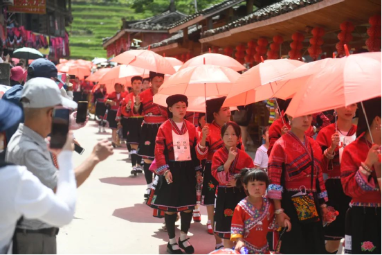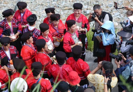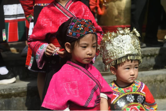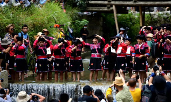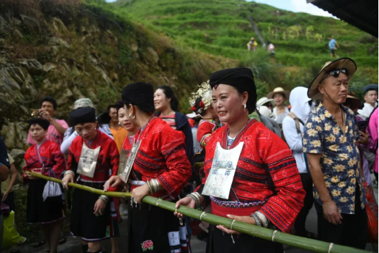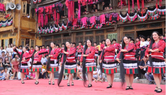 曬衣節(jié)當天還進行了嗩吶鑼鼓迎賓、瑤嫂長發(fā)梳妝展示、“抬金狗”送祝福、紅瑤服飾加工展示、紅瑤集體婚禮等活動,豐富多彩的民俗文化、濃郁的民族風情,讓各地游客流連忘返。