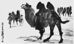 駝隊背負(fù)著生活的荷載,承載著最原始的物流,古時候的絲綢之路也是靠駝背馱出來的。浩瀚沙漠,赤地千里,群駝?chuàng)P起高傲的頭,目光炯炯地對抗西北的烈風(fēng)。人們贊美駱駝,并不是因為它偉岸雄健的身姿,而是它對惡劣環(huán)境那種淡然的態(tài)度,似乎它們與上蒼有個剛直的約定,不懼嚴(yán)寒酷暑,不懼路途遙遠(yuǎn),敢與沙塵暴面對面抗衡。它們在行走中鑄就生命的品格,天地之間,駝印曲曲折折,一路向前……