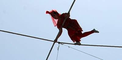 “達(dá)瓦孜”既是少數(shù)民族傳統(tǒng)體育運(yùn)動(dòng)表演項(xiàng)目,也是節(jié)日里娛樂活動(dòng),它有雜技和體育的雙重特點(diǎn)。“達(dá)瓦孜”高空走繩表演十分壯觀,在空曠的場(chǎng)地上,中間聳立三十多米高的立桿,頂處扎一牌樓上掛彩旗。牌樓橫桿兩端有表演用的吊杠和吊環(huán)。表演技能的繩索長(zhǎng)八十多米。表演者手持長(zhǎng)約6米的平衡桿,不系保險(xiǎn)帶,在繩索上作前后走動(dòng)、盤腿端坐、蒙眼行走,甚至腳踩碟子、飛身跳躍等一系列驚心動(dòng)魄的動(dòng)作。經(jīng)過不斷實(shí)踐和發(fā)展,“達(dá)瓦孜”表演技巧有了新突破,在濃郁民族風(fēng)味維吾爾族民間樂曲伴奏中,表演者輕松自如地在、高空繩索上踏著節(jié)拍跳舞歌唱,并且敏捷地變換著高難動(dòng)作。