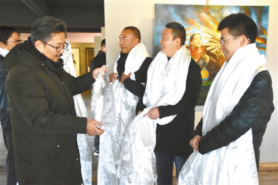 拉薩市文聯(lián)、拉薩市美術(shù)家協(xié)會的會員們向索曼尼(右二)等藝術(shù)家獻(xiàn)哈達(dá),慶祝2018年拉薩市美術(shù)家協(xié)會索曼尼、張德才和次格等藝術(shù)家的作品畫展成功舉辦。