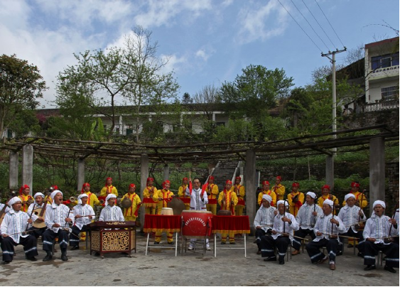民俗性。建始絲弦鑼鼓產(chǎn)生及發(fā)展是以廣泛的民俗活動為載體的。因為獨特的演出形式,其樂隊配置可大可小,小到5人的基本配置,大到幾十人的鑼鼓喧天。既可登大雅之堂,又可進入千家萬戶;既可坐著表演,又可在行進中演出。它既是表演藝術(shù),又可以和紅白喜事渾然一體,成為紅白喜事活動主體不可分割的部分,所以建始絲弦鑼鼓廣泛用于福壽、生子、婚喪、嫁娶、造宅、祝壽、開業(yè)慶祝等民間民俗活動,而在不同民俗活動中,又有著不同的使用禮儀和禁忌。