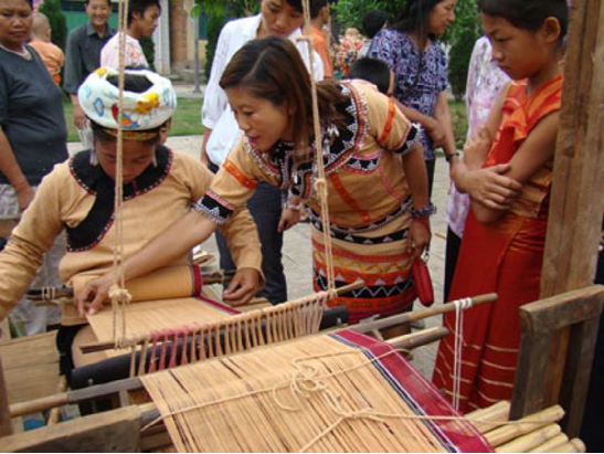 2010年上海世博會(huì)活動(dòng)周期間,一臺(tái)名為《記憶云南》的18項(xiàng)非物質(zhì)文化遺產(chǎn)展示成為最吸引眼球的亮點(diǎn)之一?;顒?dòng)現(xiàn)場,18名云南非物質(zhì)文化遺產(chǎn)傳承人和民間藝人展示白族布扎、納西族東巴畫、傣族剪紙、傣族竹編、佤族織錦技藝等制作技藝。其間展示的佤族織錦技藝在民族文化風(fēng)情濃郁,文化底蘊(yùn)深厚的耿馬縣佤族村寨里流傳甚廣。在耿馬的佤族村寨里,婦女們一般都會(huì)紡線織布,佤族傳統(tǒng)服飾也多用自染自織的土布縫制。此地佤族傳統(tǒng)服飾按地域分為兩大類。一類是分布在耿馬鎮(zhèn)、四排山鄉(xiāng)的傳統(tǒng)服飾,以女性身著佤族紅色短衣筒裙、男子身著佤族黑衣寬褲為標(biāo)志;一類是分布在勐簡鄉(xiāng)大寨村的“黃衣阿佤”服飾,以女性身著佤族黃衣筒裙、男子身著黃衣寬褲為標(biāo)志。佤族婦女所用的紡線有棉線、麻線兩種。棉主要是草棉,麻主要為苧麻和野生火麻,紡線采用內(nèi)地傳入的有紡錘的紡車。在耿馬鎮(zhèn)芒國村芒俄村民小組等佤族聚居村寨,筆者先后目睹了佤族織錦的全過程。只見紡織 中的佤族婦女一個(gè)個(gè)端坐在紡車前,凝神專注地操持著手中的活計(jì)。她們左手持麻,右手持紡錘,將紡錘放在大腿上一搓,紡錘轉(zhuǎn)動(dòng)起來后,把麻纖維慢慢從左手拉出并捻成線,紡好一截線便將它繞到小竹棍上。如此這般不停地左右穿梭,又不斷地再搓、再捻,紡出的布匹紋理細(xì)密、結(jié)實(shí)挺拔。耿馬四排山鄉(xiāng)織錦的佤族婦女,大多采用一套竹木制的很原始的腰機(jī),前后上下共有十七個(gè)零件。紡線時(shí),她們將線的一頭栓在婦女腰上,另一頭用木棍穿好,擱在織布處釘在地上的兩根木樁上??棔r(shí)兩頭繃緊,將繞在木棍上的緯線穿到經(jīng)線的中間,然后用抒刀把線打緊。這種織法節(jié)奏雖然慢一些,但織出的布更加厚實(shí)緊繃,適用于紡織粗布和麻袋。在勐簡鄉(xiāng)大寨村的穿“黃衣”的佤族婦女,用黃土、玉米粉、茶葉、小飯豆、欖樹皮等7種植物做原料浸染的黃色棉線織錦,使用的有竹木制腰機(jī)和紡錘紡車兩種??楀\時(shí),只見她們一邊捻線,一邊傳遞紡錘。不織時(shí),又把紡錘和抒刀拆下,依然卷起放好。來自耿馬鎮(zhèn)、四排山鄉(xiāng)、勐簡鄉(xiāng)的佤族群眾介紹,中華人民共和國成立后,由于商店里賣的布料比佤族自織的布料更價(jià)廉物美,佤族人家自己紡織制作服飾的已經(jīng)不多,但是縫制麻布被和麻袋用的麻布,還是多數(shù)來源于自家紡織,尤其是佤族村寨婦女穿的裙子,也必須是自己織,不然會(huì)被人同族人恥笑為愚笨和懶惰。2009年以來,每年5月中旬,耿馬都要舉辦佤族“青苗節(jié)”慶典活動(dòng)?;顒?dòng)期間,該縣不僅上演豐富多彩的文藝節(jié)目和民間體育比賽項(xiàng)目,還現(xiàn)場展示該縣獨(dú)具特色的佤族織錦技術(shù)??楀\展示中,來賓增長了對(duì)佤族傳統(tǒng)手工技藝方面的知識(shí),不少圍觀群眾還饒有興趣地一邊詢問織錦者,一邊親自動(dòng)手體驗(yàn)這項(xiàng)古老而傳統(tǒng)的紡織技藝。