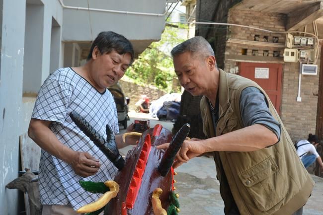 家住鎮(zhèn)遠(yuǎn)縣?陽鎮(zhèn)東關(guān)社區(qū)的皇安東,今年68歲,雖然年近古稀,但精氣神堪比五十來歲的中年人,皇安東介紹由于個(gè)人愛好,8歲時(shí)與龍舟接下了深厚的情緣,對“龍”文化研究的執(zhí)著像一如往日對戀愛的投入充滿激情和憧憬一樣,經(jīng)過60多年的龍舟文化研究探索,他手工雕刻的龍頭威武靈動(dòng)融匯鎮(zhèn)遠(yuǎn)傳統(tǒng)文化精髓,“鎮(zhèn)遠(yuǎn)賽龍舟”已被列為國家非物質(zhì)文化遺產(chǎn)項(xiàng)目名錄。皇安東49歲開始自學(xué)雕刻龍頭,鎮(zhèn)遠(yuǎn)端午節(jié)每年祭祀用的龍頭幾乎出自他手,雕刻的龍頭已上數(shù)百頭。當(dāng)筆者提到皇安東為何歷經(jīng)六十多年對雕龍頭的“手藝”癡心不改時(shí),他笑著爽朗地說:“我一生雕龍頭,主要的精神動(dòng)力是對鎮(zhèn)遠(yuǎn)傳統(tǒng)龍舟文化的熱愛和傳承。”皇安東一家人整天在“龍”的藝術(shù)空間里過得有滋有味。