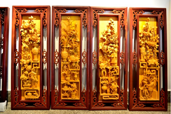 《四條屏掛件》脫胎于“格子門”的上裙板,是由實(shí)用到觀賞的一種很好的轉(zhuǎn)換,是目前最走俏的新產(chǎn)品,無論是賓館客廳或居家,古樸典雅的木雕“四條屏”會(huì)增添不少東方文化的雅趣,越來越受到人們的喜愛,許多人都把它作為木雕藝術(shù)珍品收藏。為了給世人留下藝術(shù)精品,許多工藝師潛心研究設(shè)計(jì)、精心雕刻,用半年、甚至一年多的時(shí)間才完成一件“四條屏”。這些精心之作,疏密有致、變化統(tǒng)一,構(gòu)圖飽滿,穿插纏繞,重重疊疊的層層透雕,無不凝聚著制作者的智慧與心血?!端臈l屏》的圖案設(shè)計(jì),主要有三種內(nèi)容:(1)博古;(2)花卉;(3)花鳥。人物、山水類型的極少。圖案喻意與格子門相近。