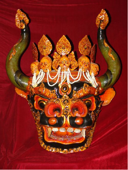 泥塑面具的制作也很有講究:“首先要將面具模型徹底風(fēng)干,然后在表面敷上摻有液體樹膠和面粉熬制而成的糨糊,再用一小塊布將風(fēng)干好的模子包好裹嚴(yán),接著要敷一層柴薪混合物,同樣用另一塊布把泥模包實(shí),反復(fù)四五次后,將模子放好讓它自然干透。這些步驟做完后,要用一根棍子敲打出包在里面的泥模,這樣就形成了布、樹、膠和面粉做成的一種面具。當(dāng)然,做好后還要進(jìn)行彩繪、涂清漆,這樣才能讓一個面具光彩奪目。”邊巴說道。