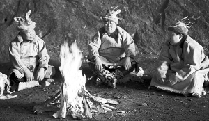 身著鄂倫春族傳統(tǒng)服裝的孟松林(中),在篝火邊講故事。孟松林供圖