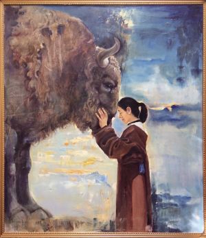 雍忠卓瑪?shù)膫€(gè)人畫展受到業(yè)內(nèi)外的諸多好評(píng),也有觀眾專程從外地去拉薩觀展。展覽結(jié)束當(dāng)天,雍忠卓瑪特意和畫作《我和它》合影,并將合影發(fā)布在社交平臺(tái)上。“這是我與牦牛博物館結(jié)緣的作品?!彼蛴浾呓榻B。畫面上,穿著藏袍的少女閉著眼睛,用左手撫摸牦牛的面頰,額頭輕觸牦牛鼻尖,表情寧?kù)o祥和。