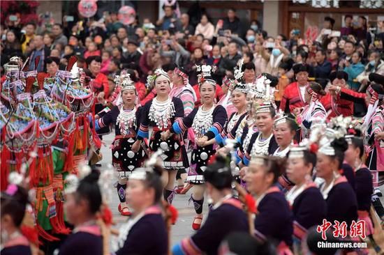 2021年11月19日,廣西龍勝各族自治縣各族民眾身著節(jié)日盛裝共跳團(tuán)結(jié)舞慶祝自治縣成立70周年。中新社記者 俞靖 攝