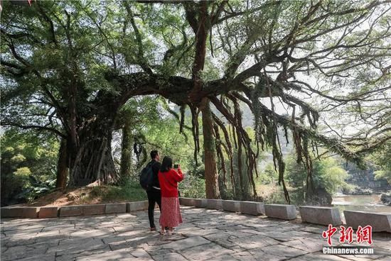 2020年10月,游客在廣西昭平縣的黃姚古鎮(zhèn)內(nèi)參觀古榕樹。中新社記者 賈天勇 攝
