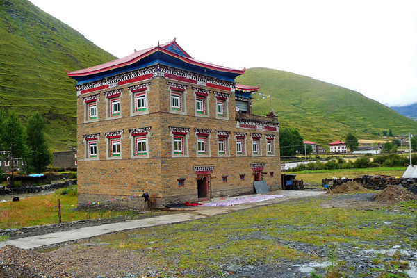 “碉院”則是一組較大的綜合性建筑,一般三層,局部四層,平面為四全院式,中間有較大的天井內院,設小花壇,可種樹木花卉。內院四周設回廊,石砌外墻用全封閉,除了門洞,墻上開少量小窗。底層為牲畜圈、雜用房;二層多為倉庫、接待房、傭工房等;三層為臥室、廚房和糧倉、珍寶庫;四層為經堂、佛堂、經書庫。有的在外墻女兒墻部分刷以黑色或棕色圓珠圖案,窗上檐一層或二層方椽挑出,作為傳統(tǒng)式藏窗形式,豐富了立面,改變了石墻面之笨拙感。