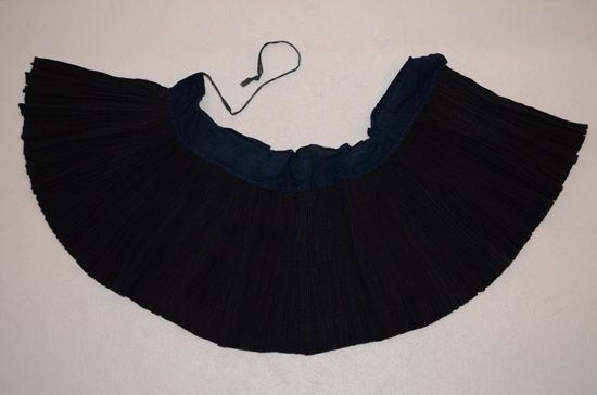 裙子腰部為家織土布,裙身細褶裙,由素色藍布、臘染布、織錦布拼連而成。