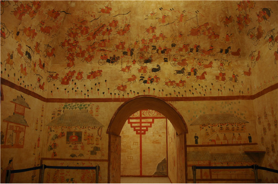 和林格爾東漢壁畫(huà)墓復(fù)原陳列展。位于和林格爾縣新店子鎮(zhèn)的小板申?yáng)|漢“使持節(jié)護(hù)烏桓校尉”壁畫(huà)墓,是秦漢文化的主要標(biāo)志性實(shí)物,是東漢莊園制度的真實(shí)再現(xiàn),也是民族團(tuán)結(jié)的重要?dú)v史見(jiàn)證。本館以1:1.5的比例進(jìn)行了復(fù)制并展示給觀眾。
