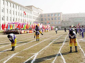 陣擺長(zhǎng)龍跑馬城?!胺直矊⑦x良才,陣擺長(zhǎng)龍對(duì)面排。正欲齊心奪勝券,格格送信出城來(lái)?!边@首詩(shī)描寫的是滿族兒童春季玩的一種游戲——“跑馬城”。玩這種游戲時(shí),孩子們分成人數(shù)相同的兩隊(duì)橫列,面向而站。玩時(shí),甲隊(duì)先誦兒歌一句,乙隊(duì)接下句,一遞一句:“機(jī)機(jī)靈,跑馬場(chǎng),馬城開(kāi),打發(fā)格格送信來(lái)!”“你要誰(shuí)?我要某某某!”被點(diǎn)到名字的兒童立刻向?qū)Ψ經(jīng)_去,對(duì)方陣營(yíng)則手臂相連形成一道防線,沖撞者如果沖破對(duì)方的防線,就從對(duì)方陣營(yíng)中挑選一人帶回自己的隊(duì)伍;如果沒(méi)有沖破對(duì)方的防線,沖撞者就被對(duì)方俘虜了。然后雙方再進(jìn)行下一輪“對(duì)話”和“沖營(yíng)”。游戲結(jié)束時(shí),以剩下人數(shù)多的一方為勝方。這種游戲最適合男孩玩,他們往往玩得滿頭大汗,樂(lè)此不疲!