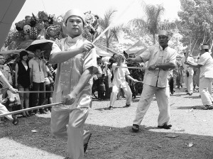 據(jù)介紹,傣族武術(shù)是傣族人民在長(zhǎng)期生產(chǎn)生活實(shí)踐中產(chǎn)生的。傣族人民從飛禽走獸的神態(tài)中吸取動(dòng)作要領(lǐng),演化出武術(shù)招式,這些武術(shù)招式既有舞蹈娛樂(lè)的性質(zhì),又有健身防衛(wèi)之功能。根據(jù)形態(tài)和招式,傣族武術(shù)有“鳳凰拳”的美稱。作為傣族民間運(yùn)動(dòng)的瑰寶,武術(shù)曾是每一個(gè)傣族男人的必修課。但目前,傣族武術(shù)這一傳統(tǒng)文化瑰寶的傳承和弘揚(yáng)面臨很多困難。