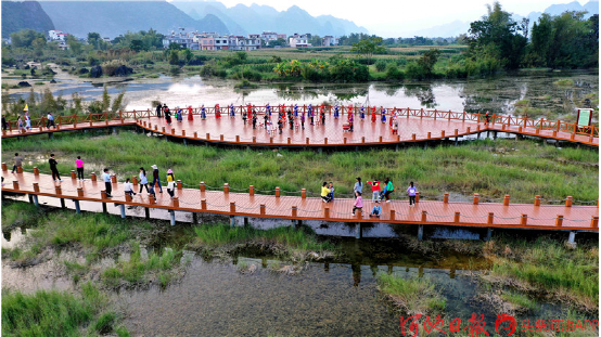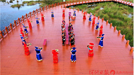 都安各族群眾在澄江國家濕地公園為游客表演打扁擔(dān)。