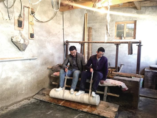 接著,父子幾人配合著,開始蹬簾子步驟。“搟簾子的步驟最關(guān)鍵?!倍藕C髡f,蹬簾子的時(shí)候,蹬的時(shí)間長了不行,短了也不行,要掌握好時(shí)間,才能達(dá)到最好的效果。“哪都需要精細(xì)化,稍不精細(xì)就會(huì)出現(xiàn)氈散了、爛了,做不成功就廢了?!闭f著,杜占財(cái)和杜占福在杜海明的帶領(lǐng)下,三人用雙腳,來來回回仔細(xì)地進(jìn)行著搟簾子。
