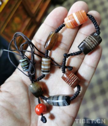 瑪瑙在那里也充滿了神秘感,纏絲瑪瑙尤其如此。但整體上,與天珠相比,纏絲瑪瑙的辨別方法更簡單一些,分類也沒有天珠那樣復(fù)雜。在市場中,商家一般只將瑪瑙分成兩類:一類是新瑪瑙,另一類是老瑪瑙。不知是商家不屑,還是缺少消費人群,新瑪瑙在市場中并不多。有天珠,尤其是好天珠的商店多有老瑪瑙,商家更多時候喜歡將二者放在一起銷售。老瑪瑙其辨識標(biāo)準(zhǔn)與天珠相似,只不過瑪瑙沒有“眼睛”之說;纏絲瑪瑙的“纏絲”數(shù)量和形態(tài)一般也不太重要,除非數(shù)量或形態(tài)極為特殊,可能此時最重要的標(biāo)準(zhǔn)就成為“物以稀為貴”了。當(dāng)然,老瑪瑙的價格一般也較高,多集中于每顆幾千至幾萬元。