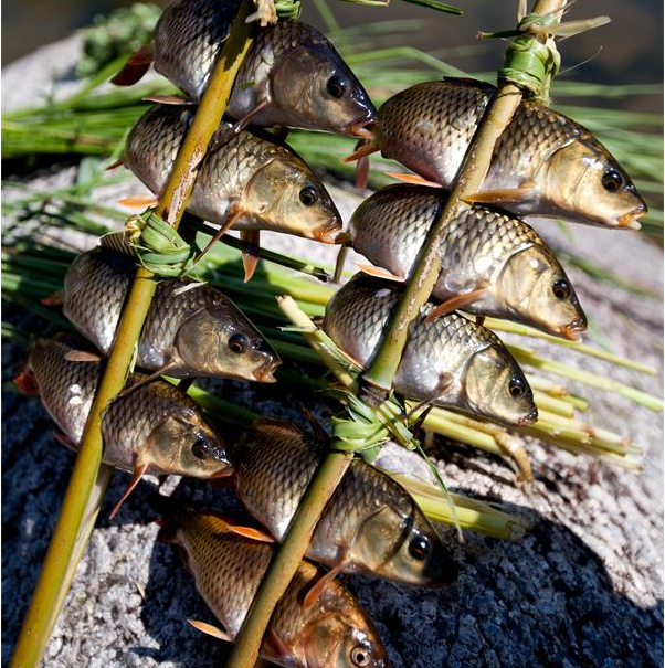 燒魚是廣西融水苗胞的習(xí)俗之一,融水的苗族同胞素有在稻田里養(yǎng)魚的習(xí)慣,每年春插,苗家人向來喜歡在稻田里放養(yǎng)鯉魚。每年的秋收稻黃時(shí)節(jié)也是田鯉肥壯之時(shí),這時(shí)來自四鄉(xiāng)八寨眾多的各民族兄弟便匯聚起來,點(diǎn)燃一堆堆篝火,燒田鯉吃野餐,盡享豐收喜悅。燒魚從9月稻黃收割開始持續(xù)到12月底才正式結(jié)束,故名“元寶山金秋燒魚季”。燒魚季節(jié),苗寨家家戶戶釀起醇濃的甜酒,蒸著香噴噴的糯米飯,帶上食鹽、辣椒、蒜苗、蔥花、薄荷等佐料上山去剪禾。晌午時(shí)候,他們?cè)谔镱^或田邊的平地?zé)鹨欢讯洋艋?,從田里抓來一籠籠活蹦亂跳的鯉魚,用樹枝或竹片把魚一條條串起,排成一排,然后放在紅彤彤的火炭上翻來覆去地烤,大約半小時(shí)左右,魚被烤炙得“呲呲”作響,水分烤干,慢慢地變黃,直至熟透,香飄四溢,遠(yuǎn)遠(yuǎn)就可聞到香味。