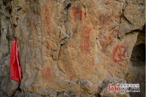 同時(shí),在金山洞壁上的清代壁題也數(shù)量眾多,既有題詩,又有紀(jì)事,還有祝文,分別題于清乾隆、道光、咸豐年間。明顯可見“貴州貴陽府”和“貴陽府廣順州”等字樣。還有1949年以后的毛主席語錄,均以赭色書寫。據(jù)說時(shí)至今日,仍有村民在巖下洞口焚香秉燭,寄拜巖神,祈禱康健?,F(xiàn)在在巖石上還能看到祈福的紅布和被煙火熏黑的巖洞。