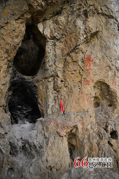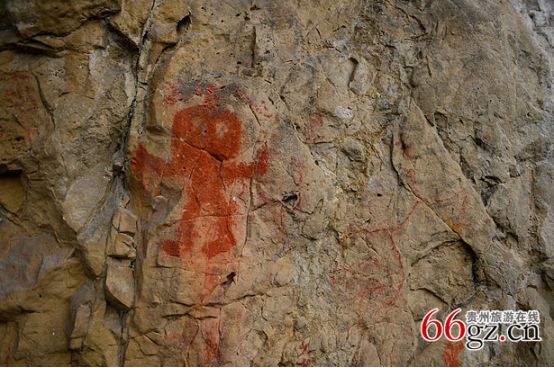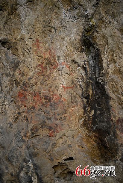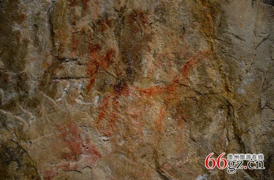 據(jù)資料載,金山洞古代崖畫以赭色涂繪人、馬、狗等等,隱約可見形態(tài)各異的大小圖像二三十個(gè)。人物多作行走狀,亦有雙手高舉者,似乎在祈禱。從其畫風(fēng)觀察,與相距不遠(yuǎn)的省級文物保護(hù)單位--長順龍家院崖畫十分相似。