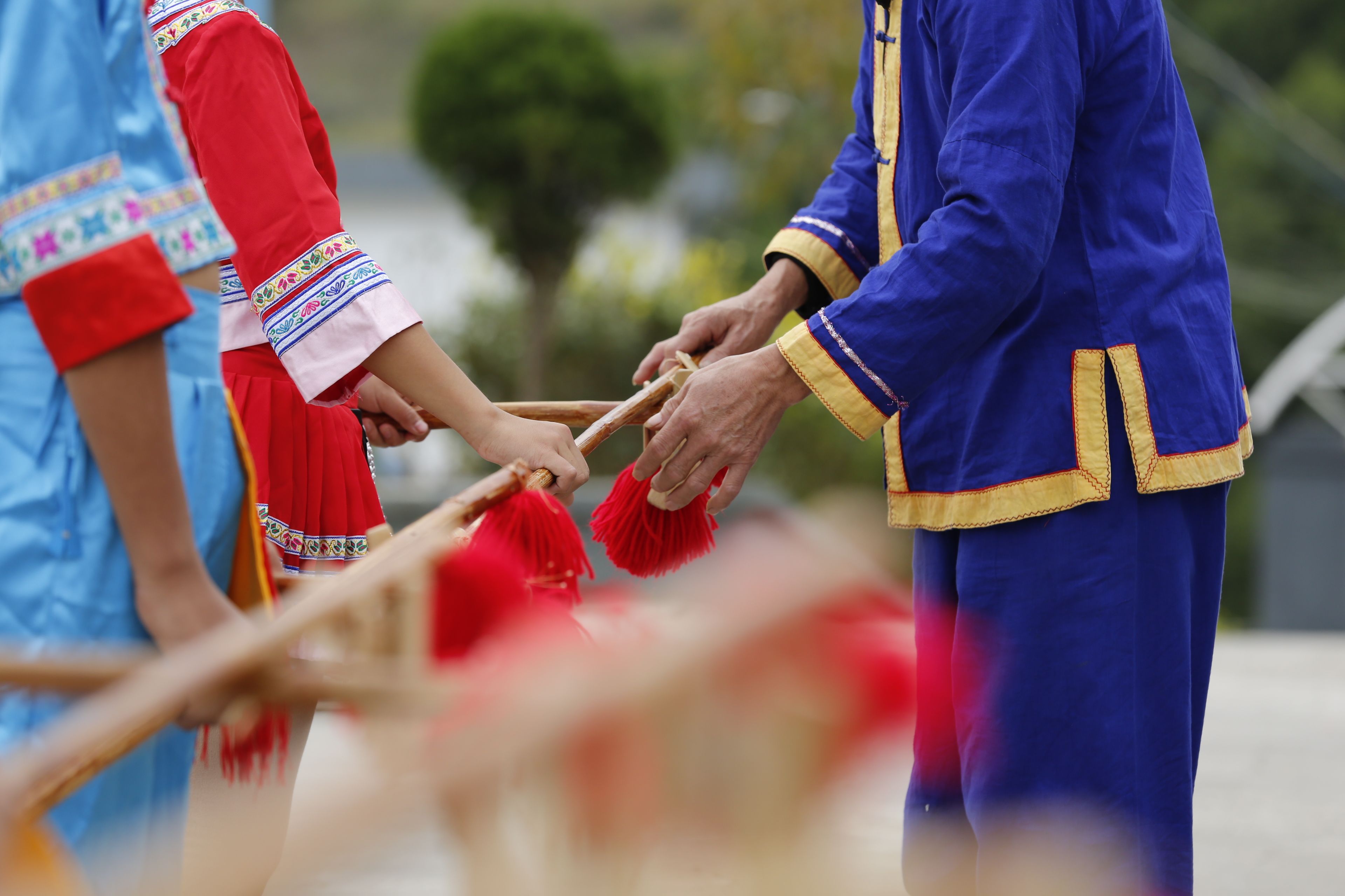 圖片說(shuō)明:貴州貴陽(yáng)苗族長(zhǎng)竹舞傳承人教孩子們持竿手法